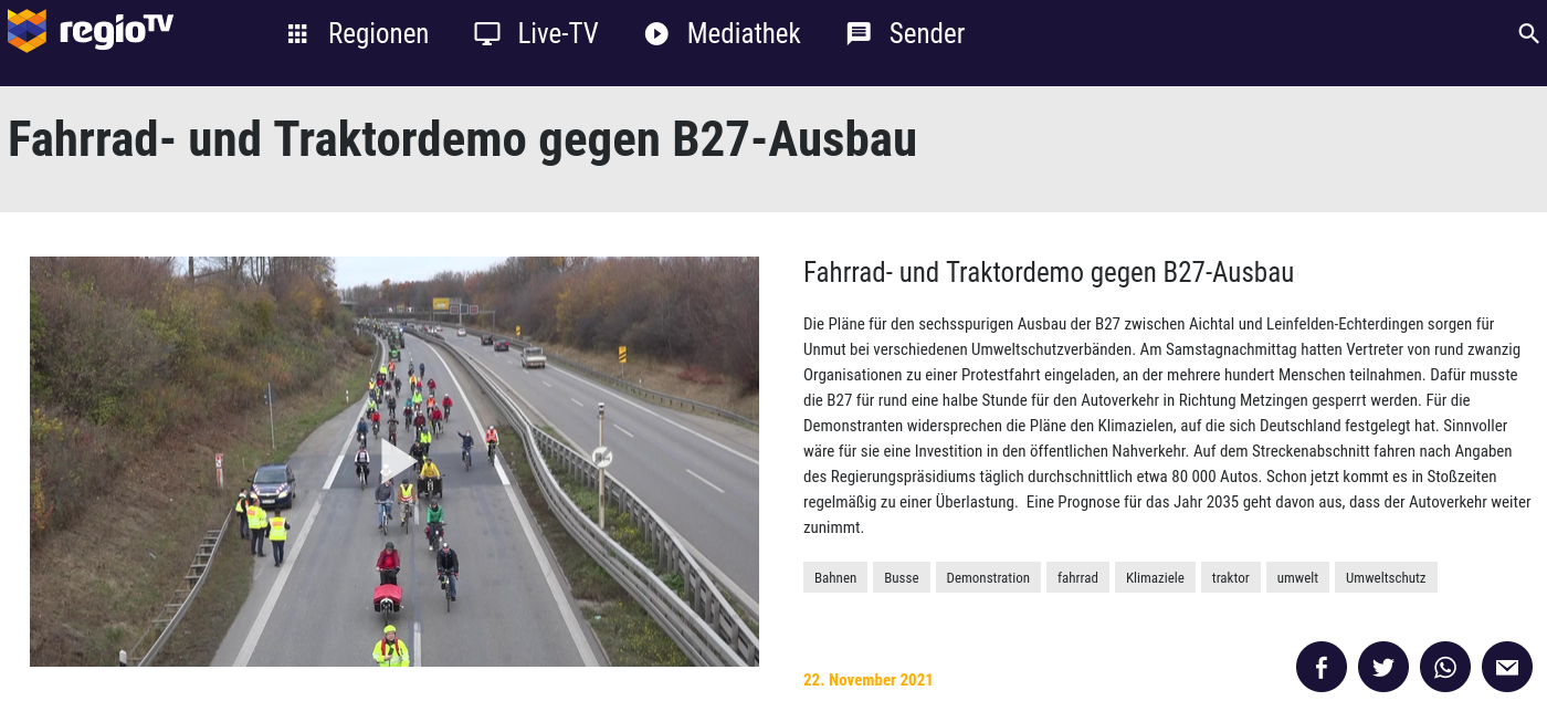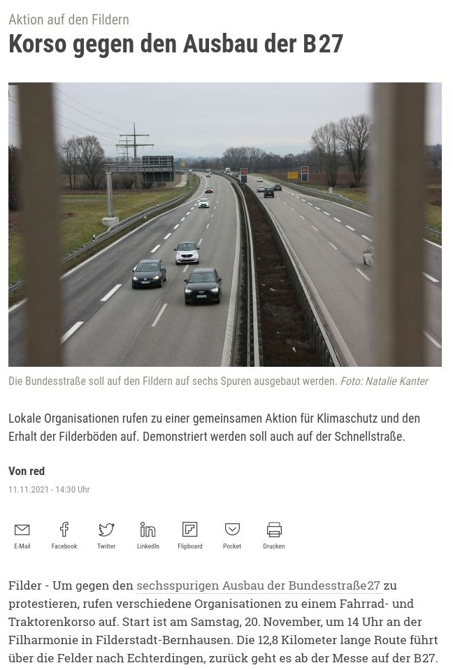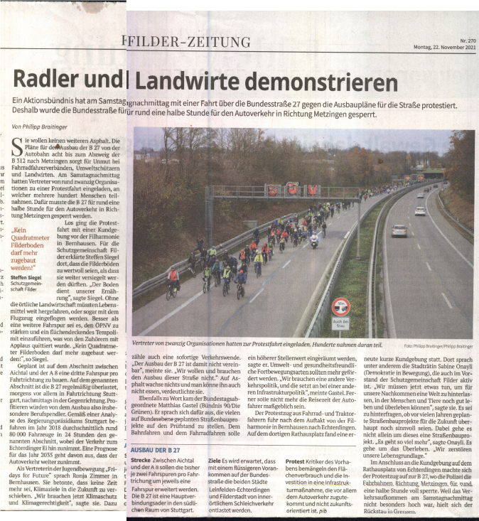 Mit einem Korso auf der B27 wollen die Organisator:innen vom Radbündnis Fildern, dem Bund Naturschutz, dem Allgemeinen Deutschen Fahrradclub, dem Verkehrsclub Deutschland e.V. und der Schutzgemeinschaft Filder die neue Bundesregierung auffordern, den B27-Ausbau nicht weiter zu verfolgen uns stattdessen ein deutlich effizienteres und klimafreundliches Mobilitätssystem zu organisieren.