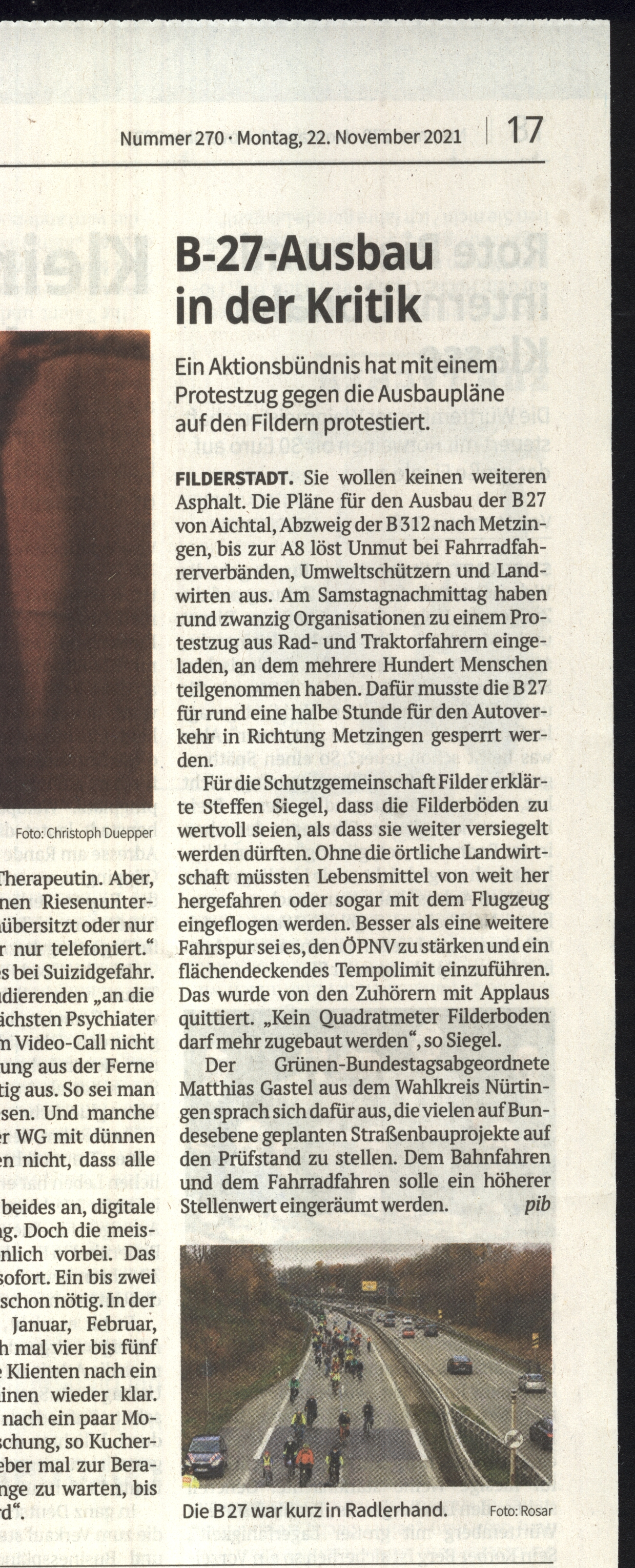 Stuttgarter Zeitung: Korso gegen den Ausbau der B27